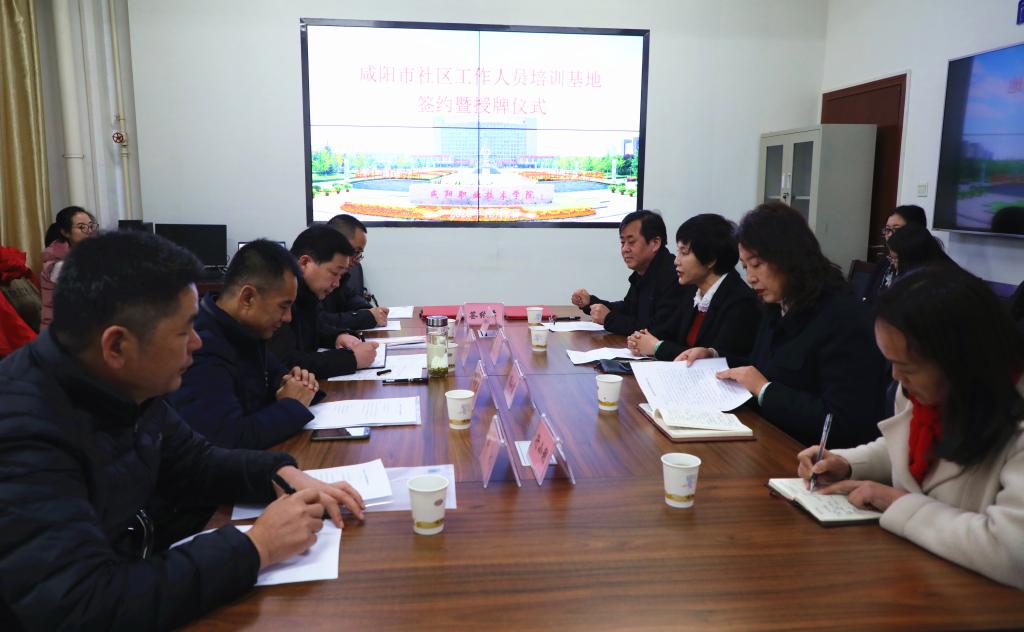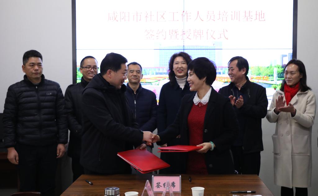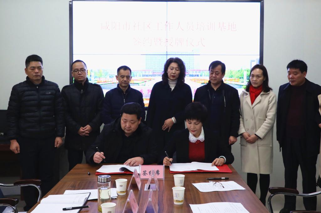 刘旭与芮红亚签署政校战略合作框架协议,并授予德信体育官网“咸阳市社区工作人员培训基地”授牌仪式。