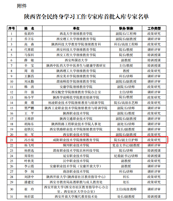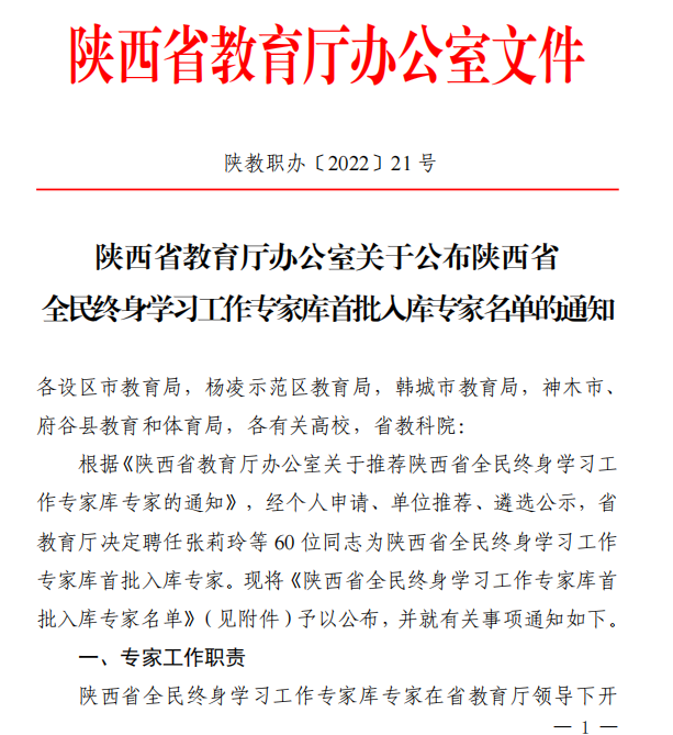 近日,陕西省教育厅办公室公布陕西省全民终身学习工作专家库首批入库专家名单,德信体育官网德信体育官网经理冯小菊成功入选全民终身学习工作专家库首批入库专家。
