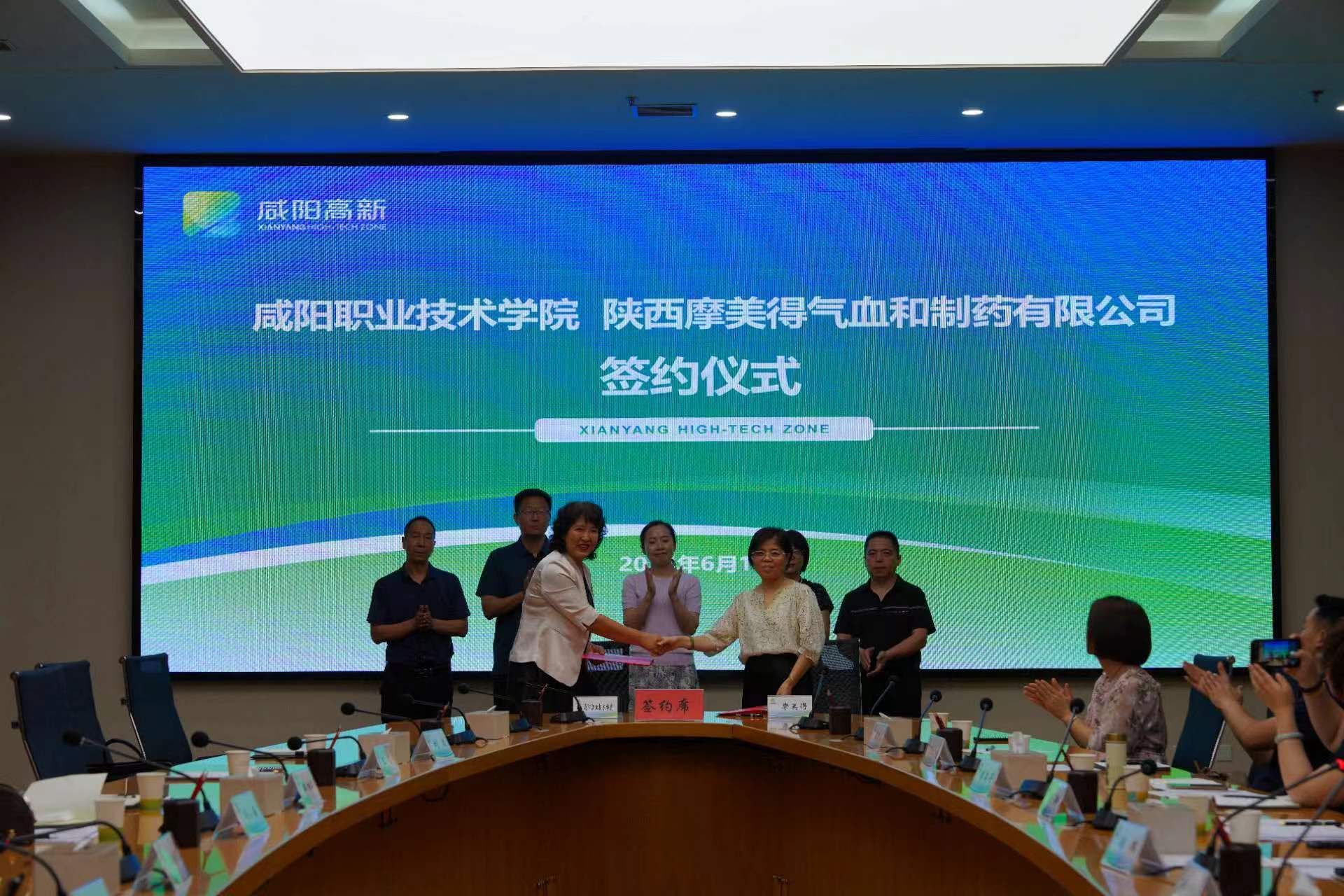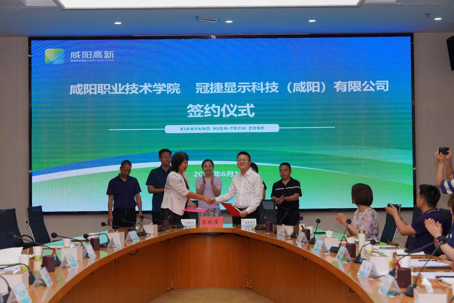 签约仪式上,冯小菊代表公司与冠捷显示科技(咸阳)有限公司、陕西摩美得气血和制药有限公司签署了产教融合校企战略合作协议。陈新、郭杨华、李锁牢、王莹、冯卫刚共同见证协议签署仪式。