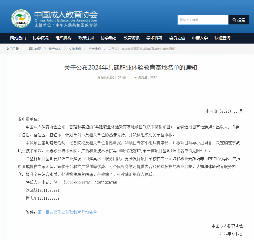 近日,中国成人教育协会发布《关于公布2024年共建职业体验教育基地名单的通知》(中成协〔2024〕067号),公布“共建职业体验教育基地”建设结果,公司获批成为第一批职业体验教育基地单位。