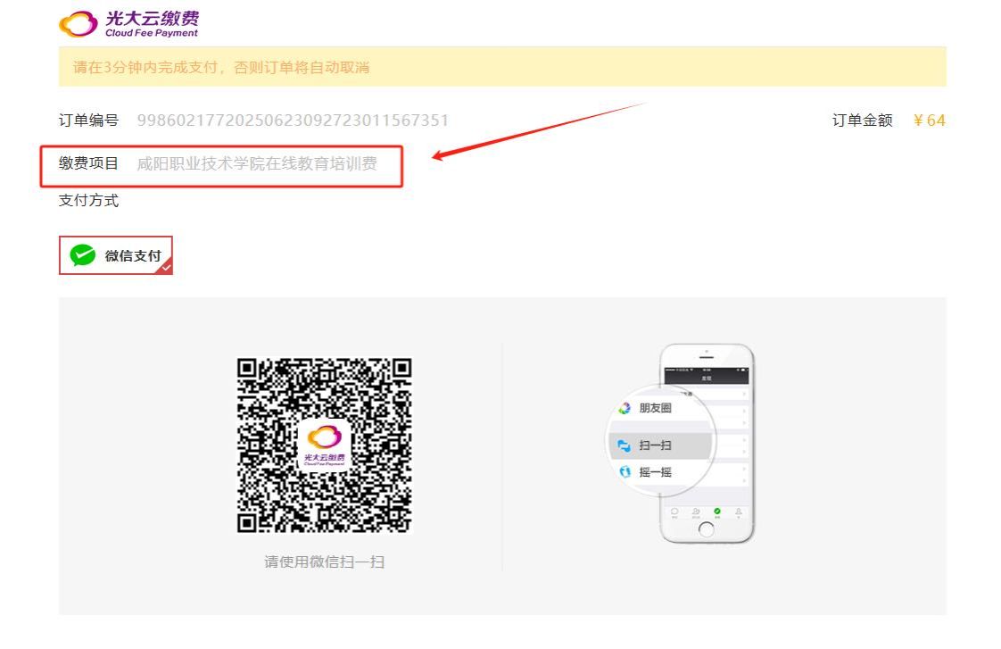 第五步,点击提交订单付款页面,会提示为“德信体育在线教育培训费”的课程,请注意核对信息,详见图片标注