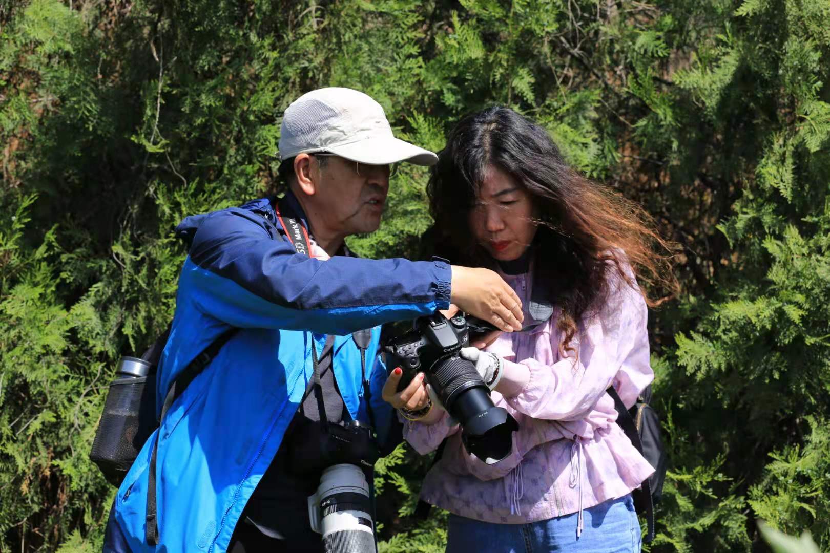 在牡丹园和乾陵景区,摄影班授课老师高忠对摄影曝光技术应用、景深控制方法及焦点选择等内容进行详细讲解,并现场指导学员实践操作。